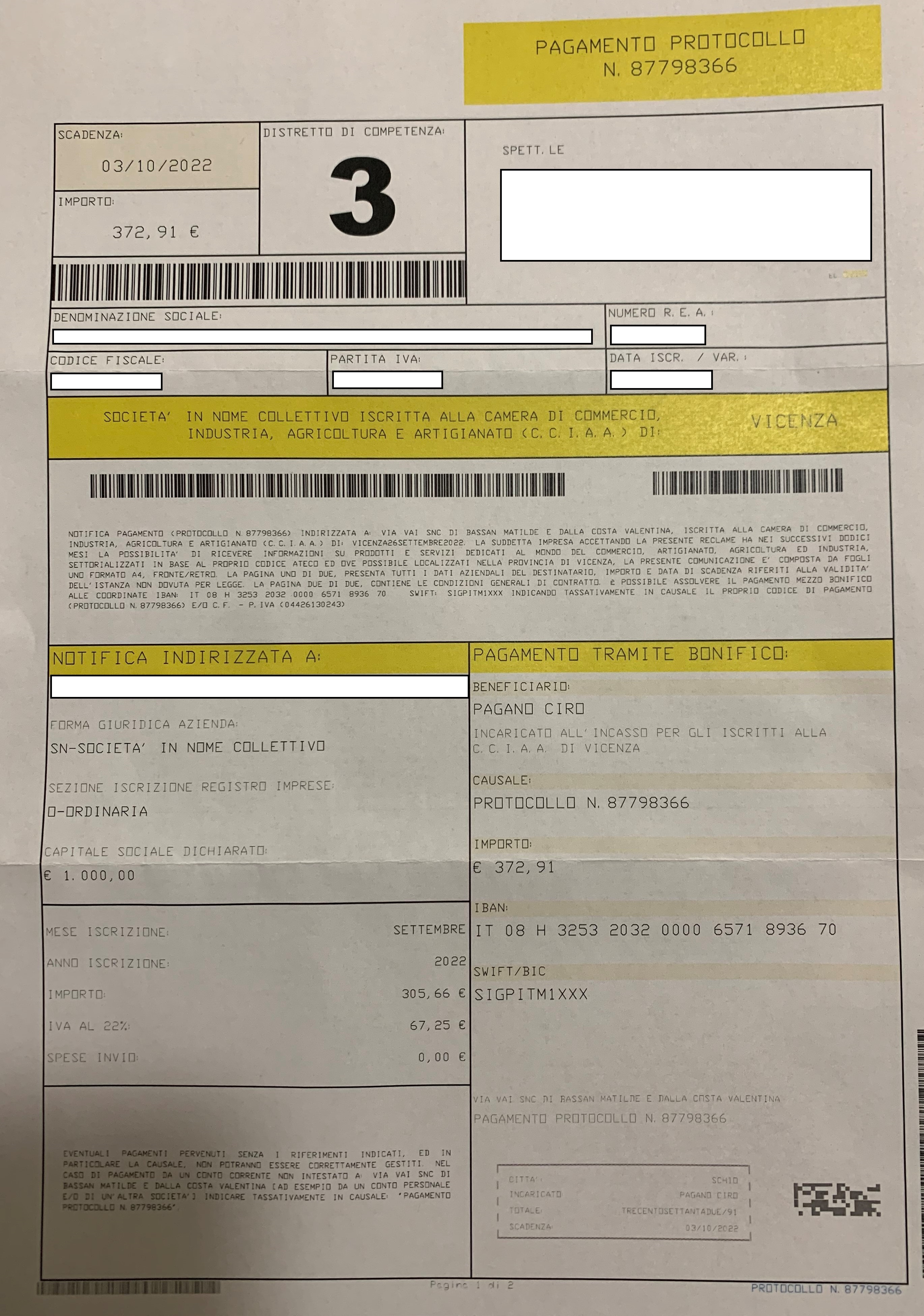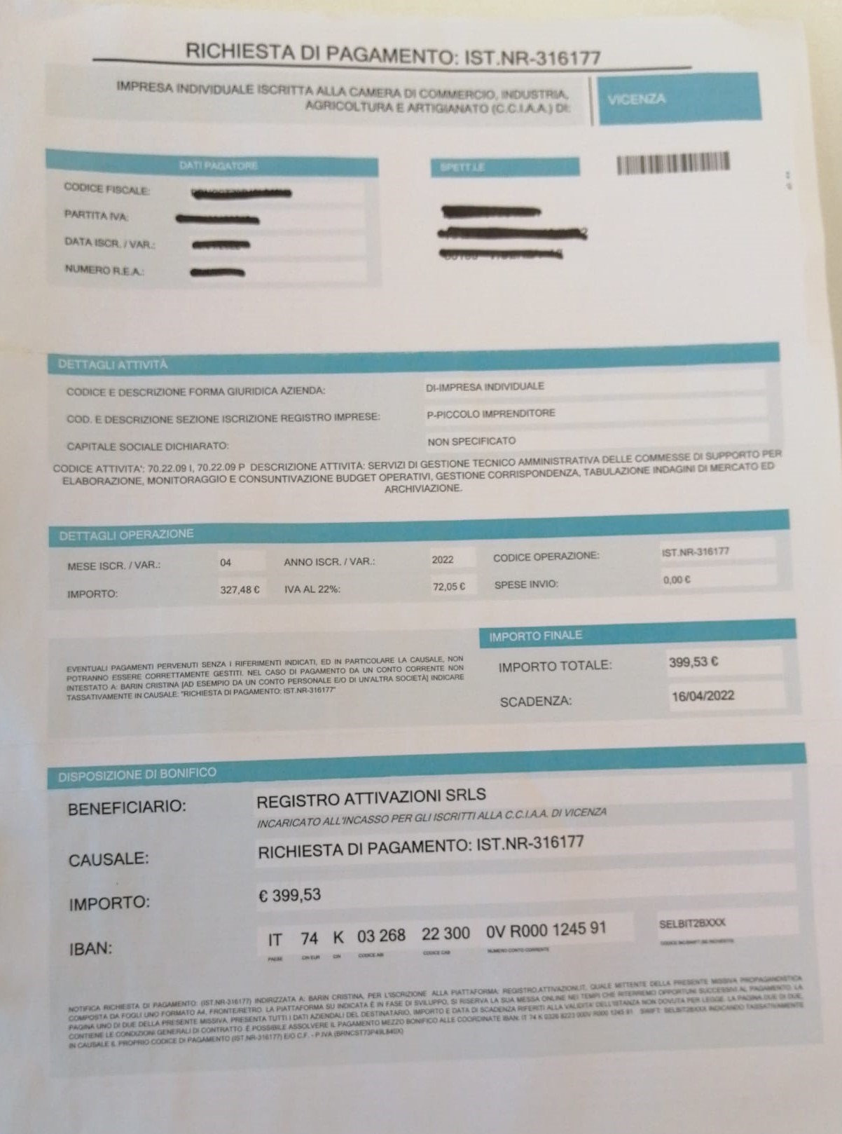 In sostanza, dalla semplice lettura del foglio pre-compilato inviato alle imprese si evince chiaramente che chi sta chiedendo di essere pagato è una persona fisica indicata come BENEFICIARIO (nome e cognome) o INCARICATO ALL'INCASSO PER GLI ISCRITTI ALLA C.C.I.A.A. che verosimilmente l'impresa non conosce, ma non è scritto che chi domanda il pagamento è la Camera di Commercio.